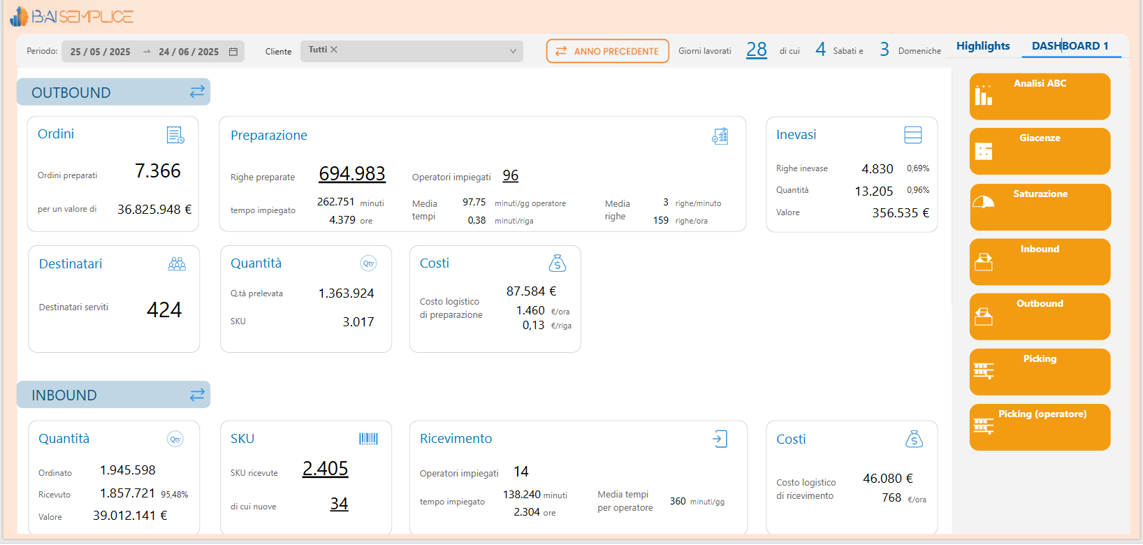 Per questo abbiamo creato B-AI Semplice, una piattaforma pronta all’uso, con KPI già pronti per i settori chiave della Supply Chain. Dalla movimentazione alla consegna, dalla rotazione dello stock al controllo dei costi, ogni dato è già al suo posto. Basta solo iniziare a usarlo.